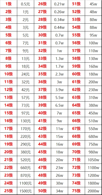 1级0.5元,2级1元,3级2元,4级3元,5级5元,6级7元,7级9元,8级13元,9级18元,10级24元,11级32元,12级42元,13级57元,14级73元,15级97元,16级130元,17级170元,18级220元,19级290元,20级380元,21级520元,22级660元,23级870元,24级1100元,25级1500元,26级0.21w,27级0.26w,28级0.34w,29级0.44w,30级0.7w,31级0.7w,32级1w,33级1.3w,34级1.7w,35级2.3w,36级3w,37级3.9w,38级5.5w,39级6.5w,40级7w,41级9w,42级11w,43级15w,44级16w,45级18w,46级20w,47级23w,48级26w,49级30w,50级34w,51级45w,52级48w,53级80w,54级88w,55级95w,56级100w,57级110w,58级130w,59级160w,60级180w,61级200w,62级230w,63级310w,64级380w,65级450w,66级510w,67级550w,68级680w,69级750w,70级980w,71级1050w,72级1100w,73级1200w,74级1800w,75级2000w