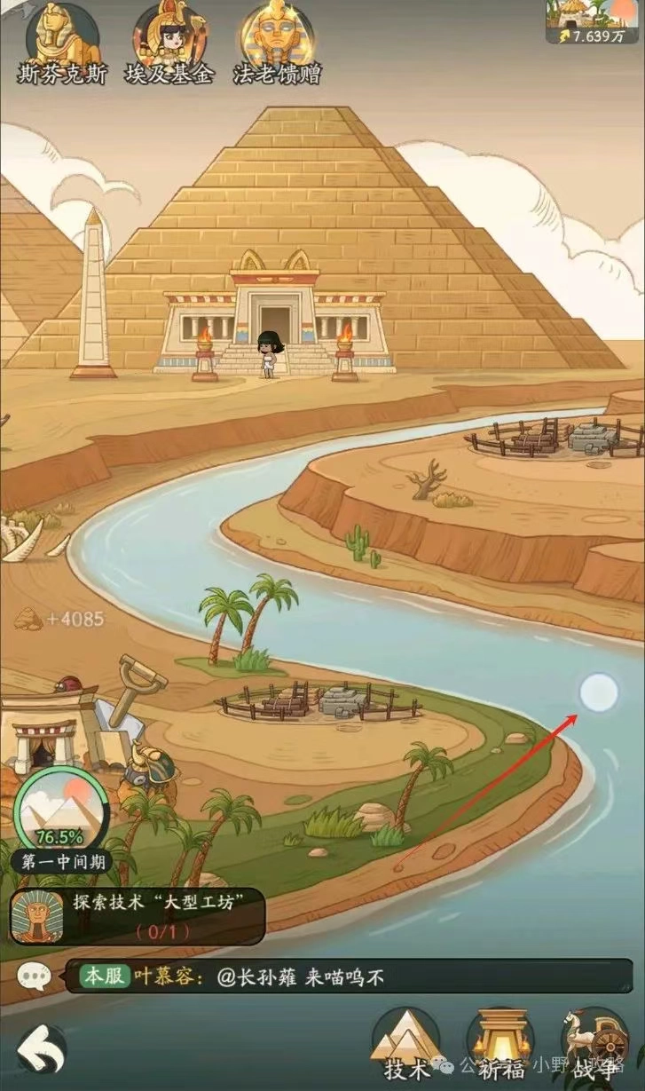 图里的这条河会有资源漂过,你可以手动点击,或者开个连点器——把画面调整成和图片一样,连点位置设在箭头指示处,开着连点挂机就能免费获取一波资源。不过这功能也就刚开建筑的时候有点用,所以要么开连点器,要么自己手动点几下就行。