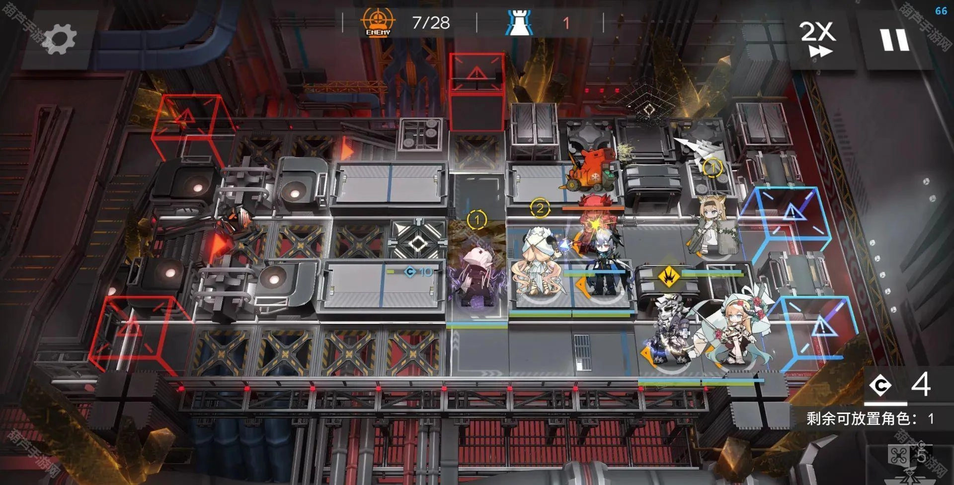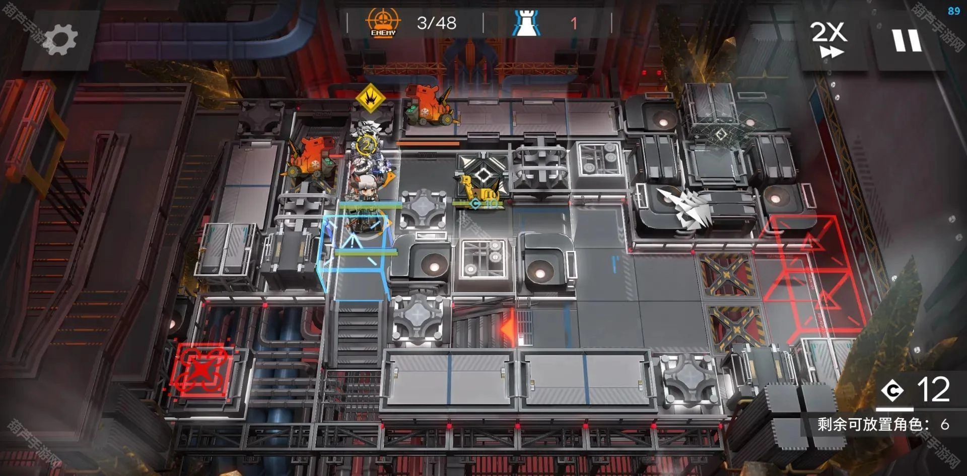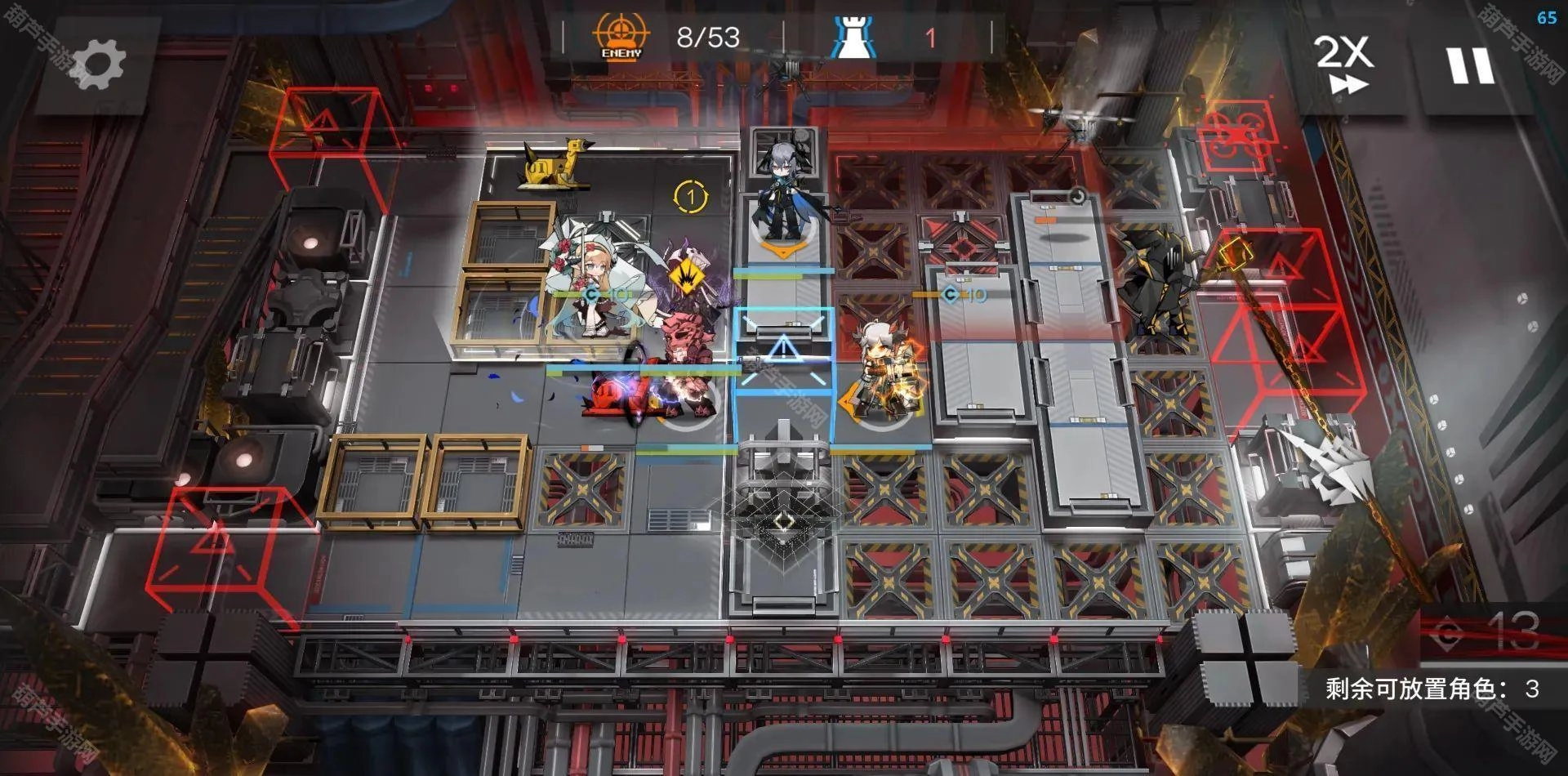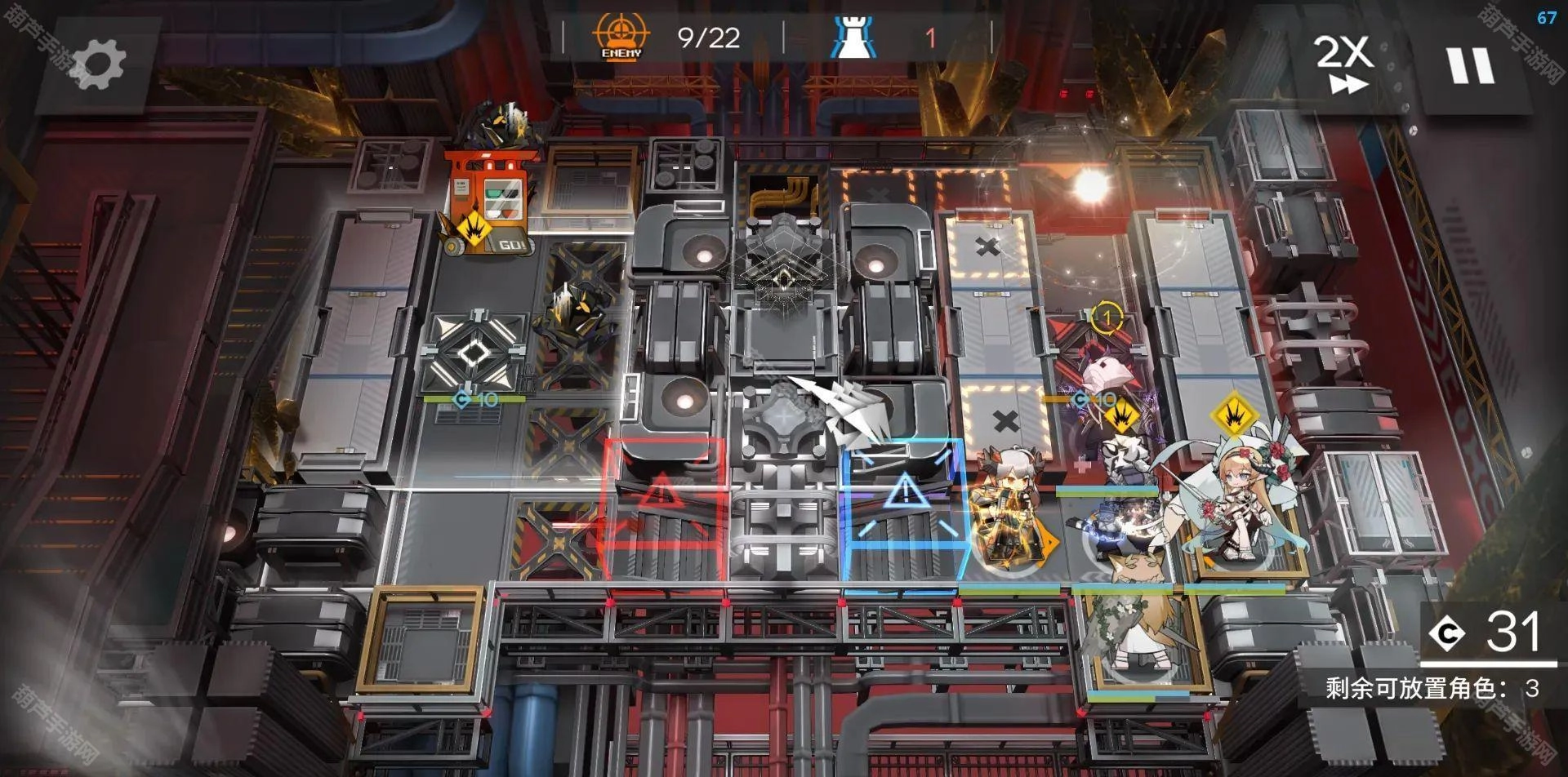 开局用先锋回费,然后部署娜仁图亚(朝左,带一技能),等费用攒够了就下EW(放在图里标的位置),接着把提丰也部署在图中对应的位置(朝左),最后把夜莺朝上部署就可以了。