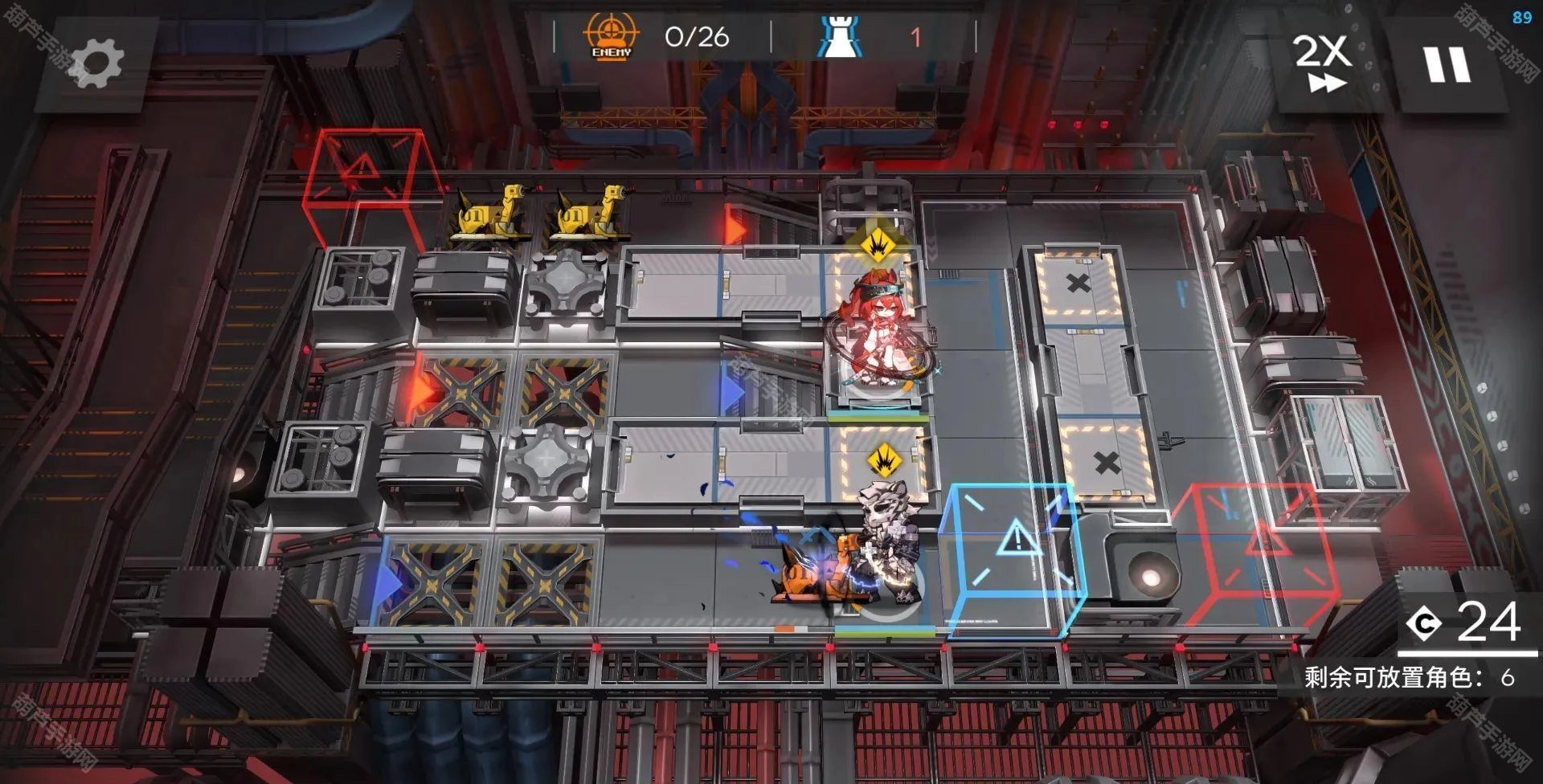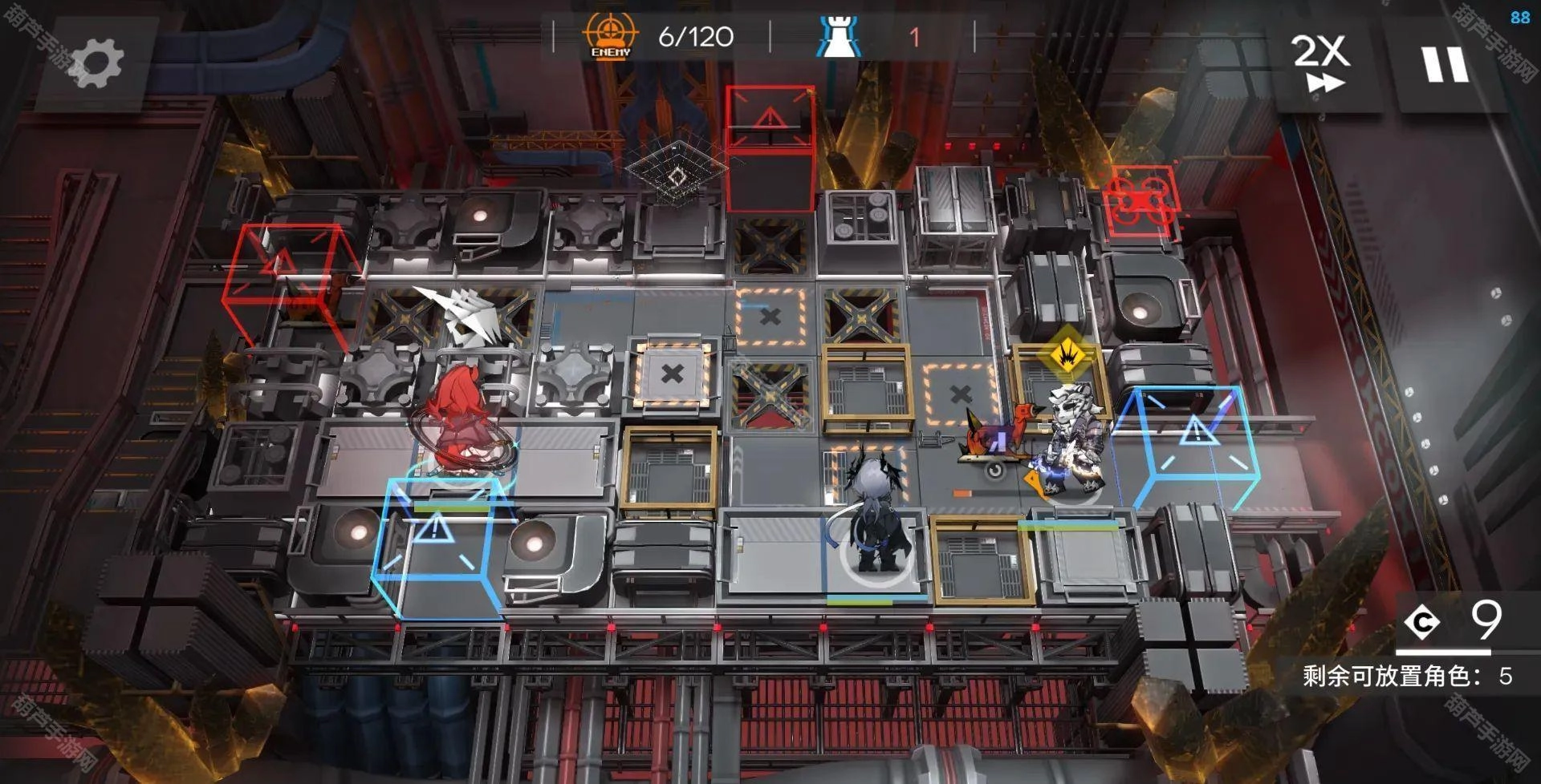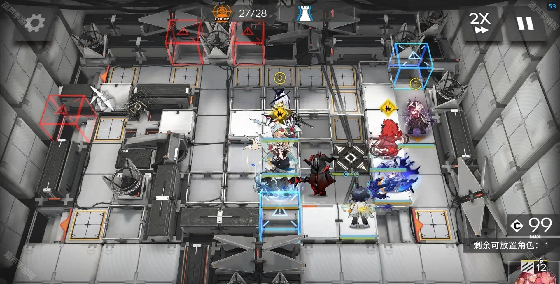 开局用先锋回费,然后部署娜仁图亚(朝左,带一技能),等费用攒够了就下EW(放在图里标的位置),接着把提丰也部署在图中对应的位置(朝左),最后把夜莺朝上部署就可以了。