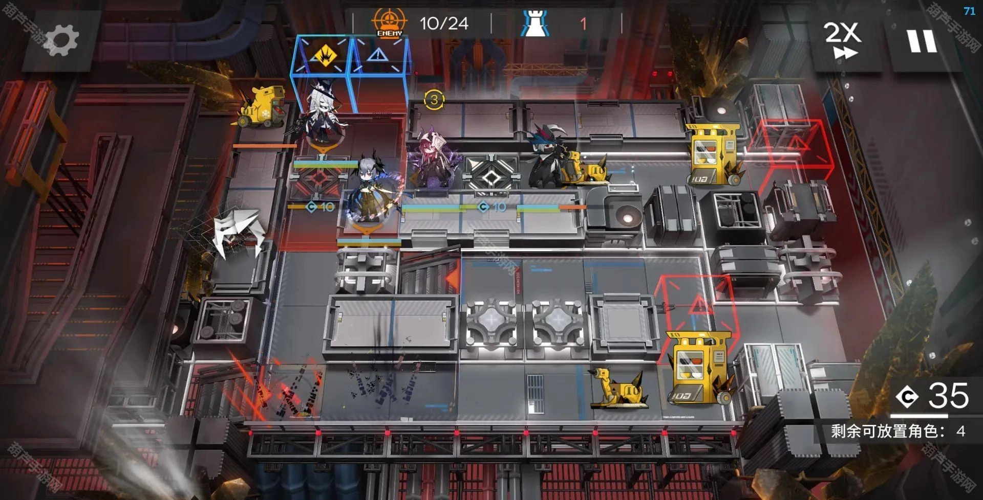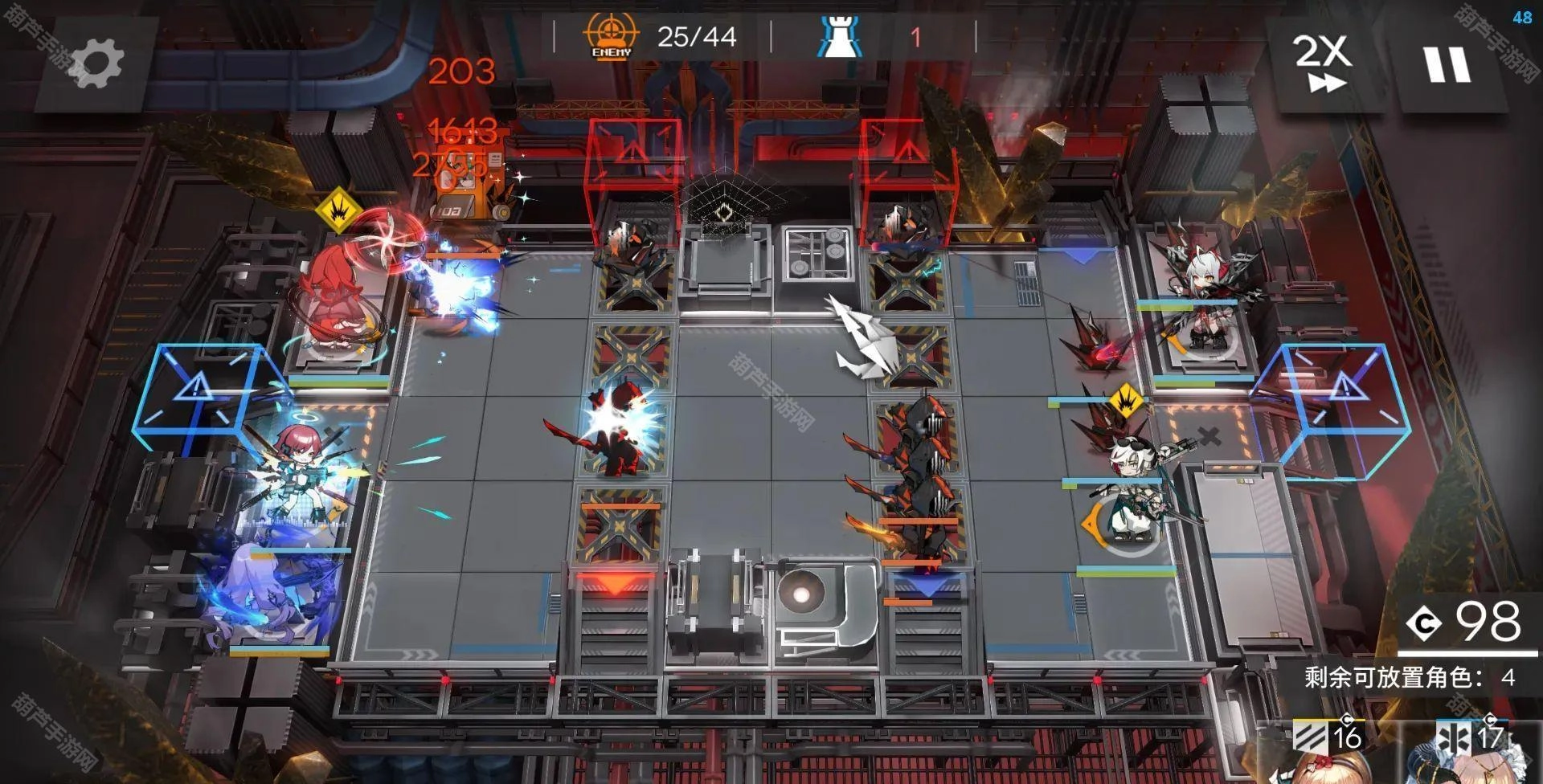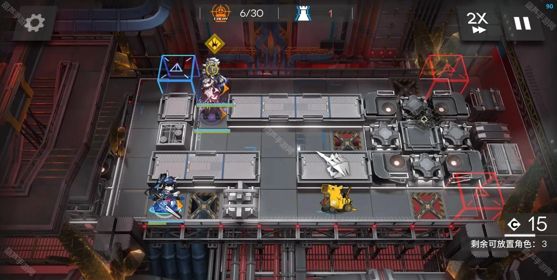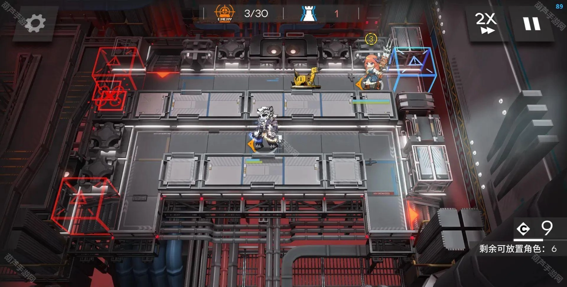 开局用先锋回费,然后部署娜仁图亚(朝左,带一技能),等费用攒够了就下EW(放在图里标的位置),接着把提丰也部署在图中对应的位置(朝左),最后把夜莺朝上部署就可以了。