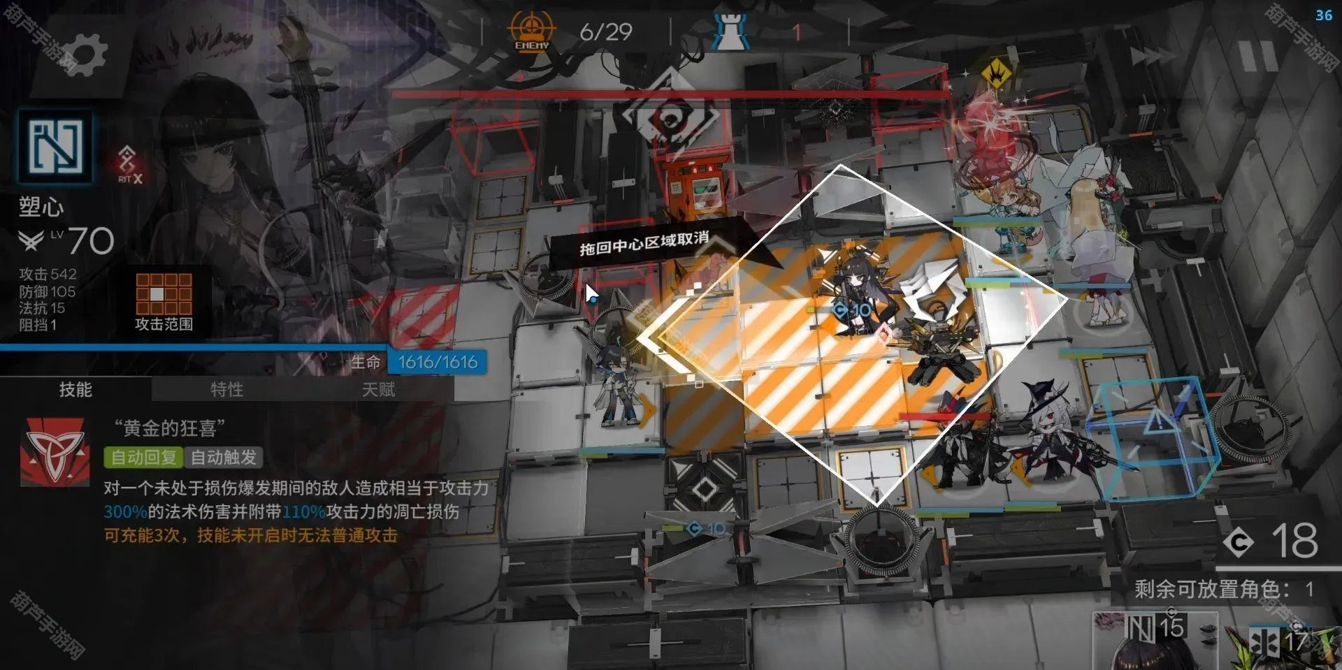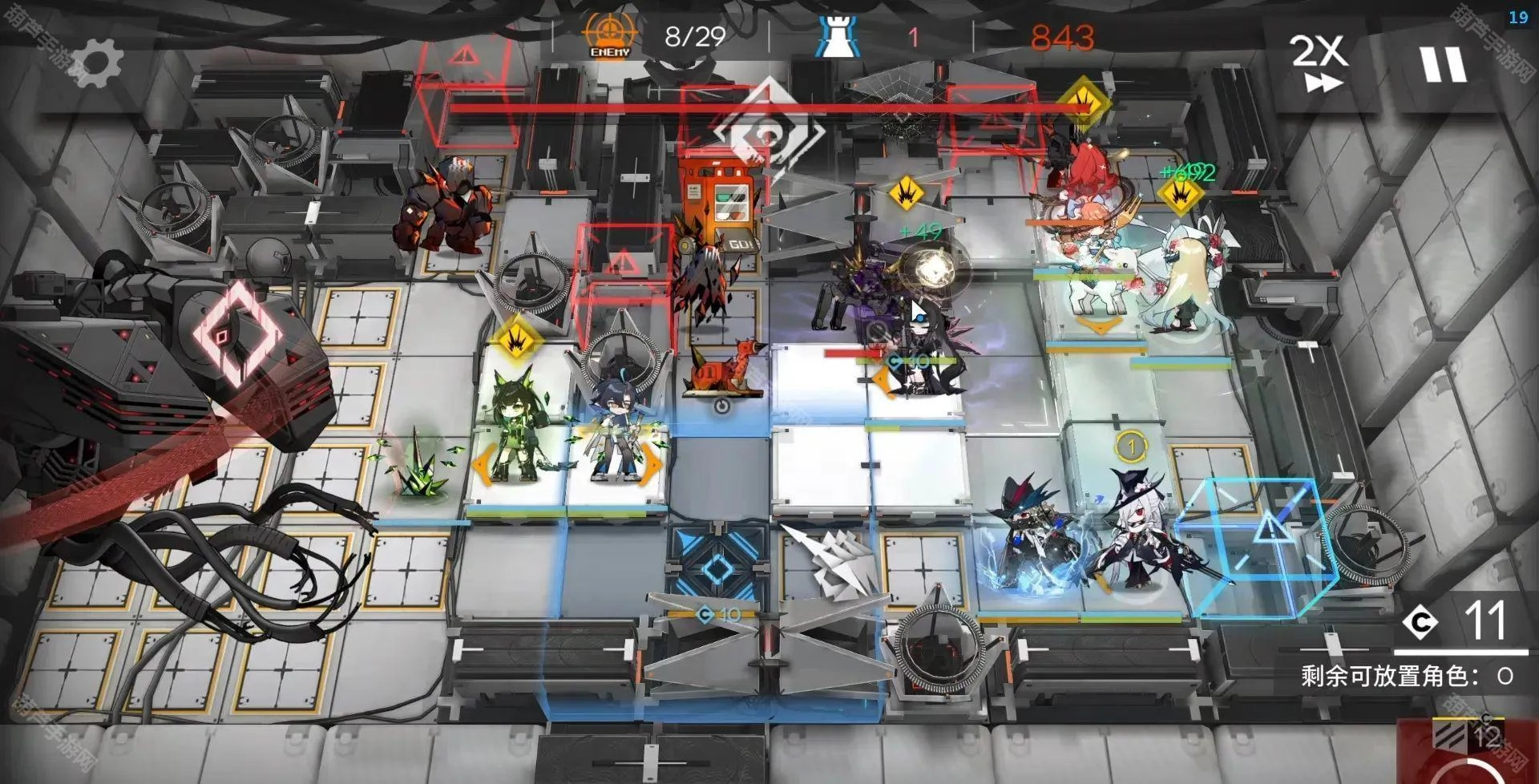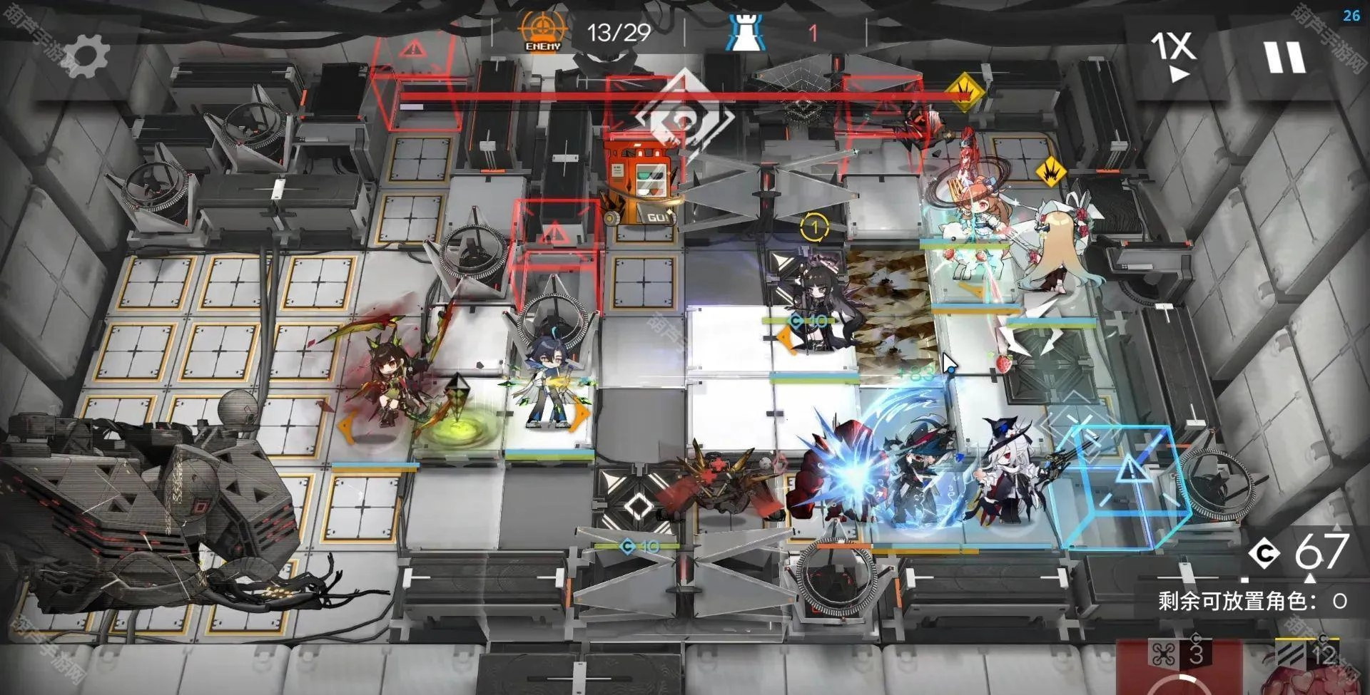 开局用先锋干员回费,山负责守住一路,塑心部署在右路朝上,小羊朝下(防止prts放入敌人),流明朝下部署,逻各斯也朝下(防止prts放入敌人),塞雷娅放在图中所示位置,这样摆完就能挂机了。