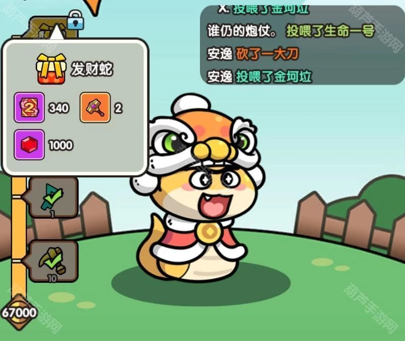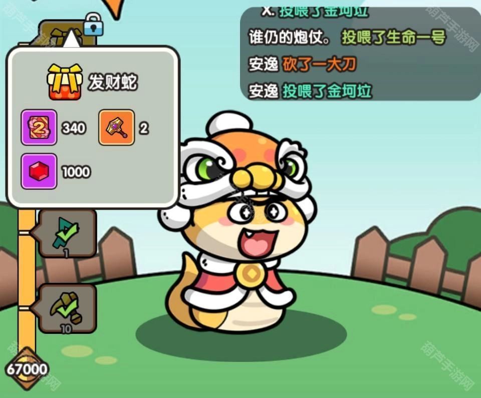 发财蛇:黄金镐头*10、哥布林村庄钥匙*1、经验水晶*10、活动道具*340、宝石*1000、金锤*2