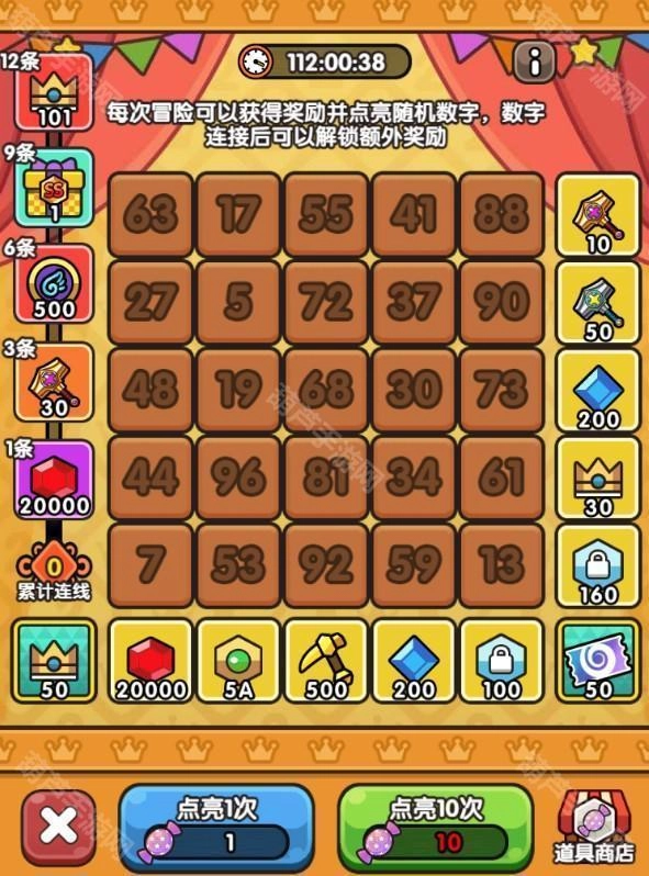 每当初次点亮一行数字,可累计一条【连线数】,共12条,达到相应次数可获得【累计奖励】。