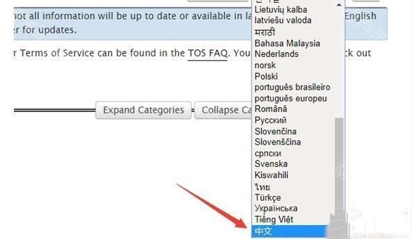 随后我们在右上角的语言栏里,通过下拉菜单滑到最底部选择中文,就像图中展示的那样。
