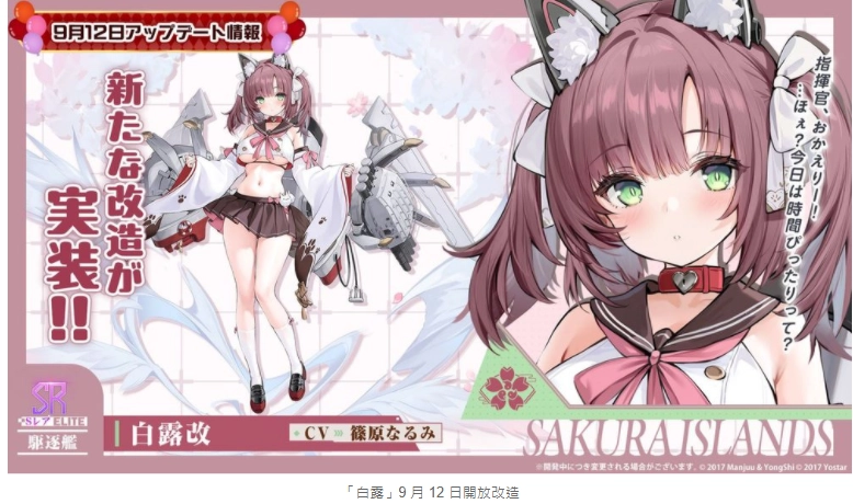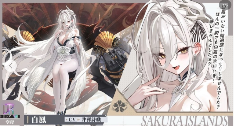 为配合新活动上线,游戏内将新增6名重樱阵营的舰船角色,具体包括:UR级航空母舰「白凤」(配音:井泽诗织)、UR级潜水航空母舰「伊404」(配音:小泽みのり)、SSR级战列舰「近江」(配音:千菅春香)、SSR级重巡洋舰「浅间」(配音:高垣彩阳)、SR级轻巡洋舰「水无瀬」(配音:后藤彩佐)以及SR级驱逐舰「妙风」(配音:新崎瑞季)。