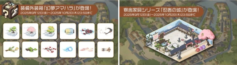 外观装备箱「幻梦天原」以及主题家具「忍者城」,同样会在9月12日到10月2日这段时间里进行贩售。