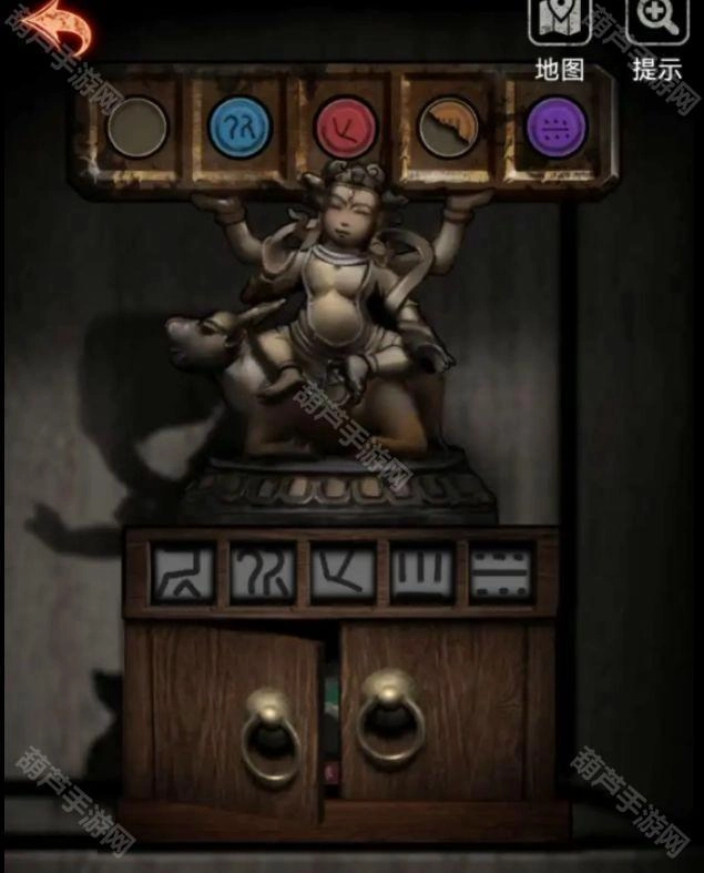 一路返回2009病房,在柜子里找到对应颜色的机关。要是记不清线索,我们再梳理一下:墙上挂画的颜色顺序是绿、蓝、红、橙、紫。之前拿到的红色和紫色按钮已经放好,还剩两个位置需要确定。结合给木偶做CT时看到的细节,第一个空缺对应的是长发“不”字图案;橙色部分虽然只有一半,但能看到三条竖线,完整图案应该是三条竖线加一条横线。把下方的图案调整成对应的样子后,下面的小柜子就会打开,从中可以获得一块石头。