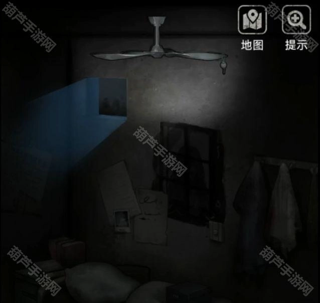 然后回来再转动一次镜片,这次照到了墙上的海报,但那不是重点,重点是海报右下角有电风扇的开关,点一下让风扇转动,能听到很清脆的物品落地声音,想必是那把钥匙已经被晃下来了。