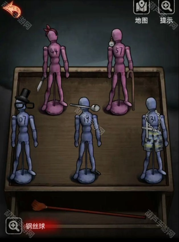 所以按照红色人偶是女孩蓝色是男孩来算,44号有头带,57号有耳环和手杖,7号不要沙滩裤和项链,19号有勺子和鞋子,44和31号都不要眼镜,所以7号只能带帽子和眼镜,31号有沙滩裤和项链,剩下的刀子只能给44号了,完成后获得痒痒挠。