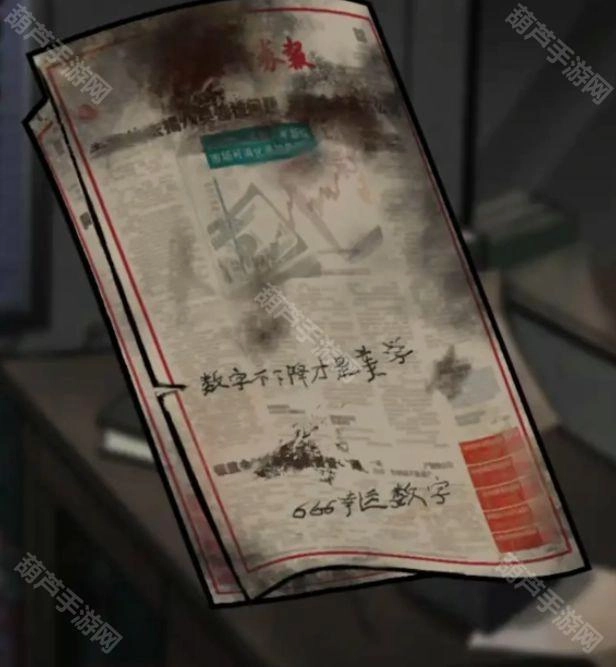 然后调查一下镜子前面的报纸,获得新的线索幸运数字是666,而且数字不能下降,也就是需要从小到大排列,再结合墙上写的2568,从小到大排列就是2568,再把幸运数字加进去变为6位数密码的话就是256668。