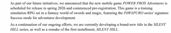 在2026财年第三季度的财报里,科乐美方面透露,他们正依托《寂静岭》这一IP开发一款“全新”的作品。作为公司打造“可随时随地游玩、覆盖多种游戏类型”产品矩阵的一环,这是《寂静岭》系列推出的新作。