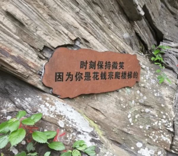 相关评论区下方,有网友表示在庐山也见过类似的“时刻保持微笑,因为你是花钱来爬楼梯的”“没人疼就去爬山,爬完浑身疼”等标语。