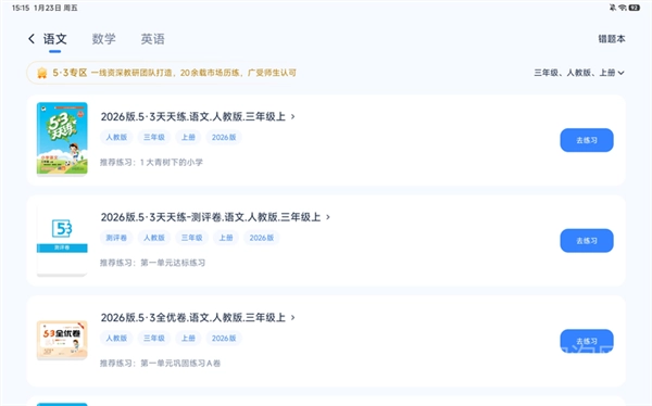 REDMI Pad 2 Pro最核心的优势在于,作为一款千元价位的平板,它能够覆盖小学到大学全学段的AI助学功能。其内置的小米教育中心就像一个“全能教辅库”,小学阶段配备《5.3天天练》同步练习资源,初中和高中则分别对应《5.3初中同步》与《5.3高中全优卷》,从课前预习、课中练习到课后复盘的全场景学习需求都能满足,用户开通教育VIP后就能解锁所有教学资源。