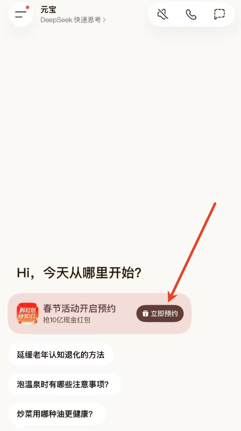 2、打开腾讯元宝App,首页会出现 “春节分 10 亿” 或者 “拆红包分 10 亿” 的预约卡片,点击该卡片即可进入预约页面。
