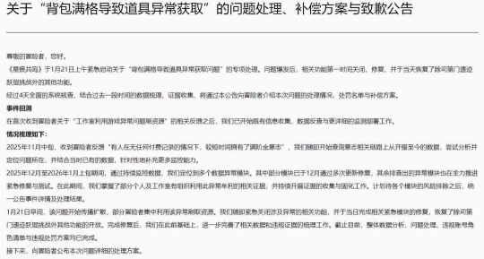 随后,官方终于公布了相关的处理结果与补偿方案,表示将对涉及相关操作的账号实施不同时长的封禁措施,其他玩家也会获得相应的补偿。
