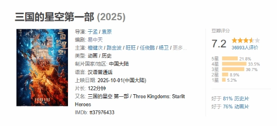 近日,由易中天担任指导的动画电影《三国的星空第一部》已在哔哩哔哩电影平台上线,截至目前,该片在豆瓣平台的评分为7.2分。