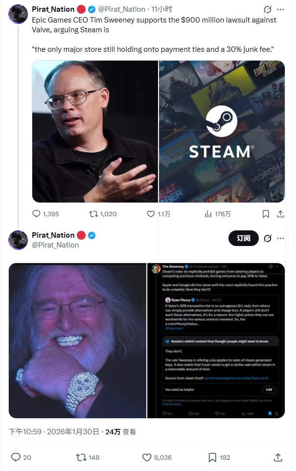 英国针对V社发起的高达9亿美元诉讼,近日已获竞争上诉法庭批准,后续将以集体诉讼的形式继续推进。而作为Epic Games首席执行官、同时也是Steam长期批评者的Tim Sweeney,随即对此诉讼表示支持,他认为案件中的相关指控“具有充分依据”。