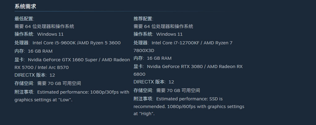 值得一提的是,《噬血代码2》官方公布的PC配置要求中,最低配置需配备GTX 1660 Super显卡,不过在该配置下仅能以1080P分辨率、低画质和30fps帧率运行游戏。若想实现1080P分辨率、高画质且60FPS帧率的游玩体验,官方推荐使用RTX 3080显卡。没错,你没看错,即便是RTX 3080这样的显卡,在这款游戏里也只能对应1080P的画质……