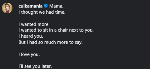 麦考利发文:“妈妈,我本以为我们还有时间。我还想拥有更多和你相处的时光。我想坐在你身旁的椅子上。你的声音我听到了。可我还有太多话没能对你说出口。我爱你。我们日后再见。”
