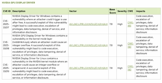 根据英伟达最新发布的安全公告,此次推出的GPU驱动版本v591.59修复了近四个高危漏洞,覆盖多个操作系统。这些安全漏洞一旦被攻击者利用,可能引发“代码执行、权限提升、数据篡改、拒绝服务及信息泄露”等安全风险。