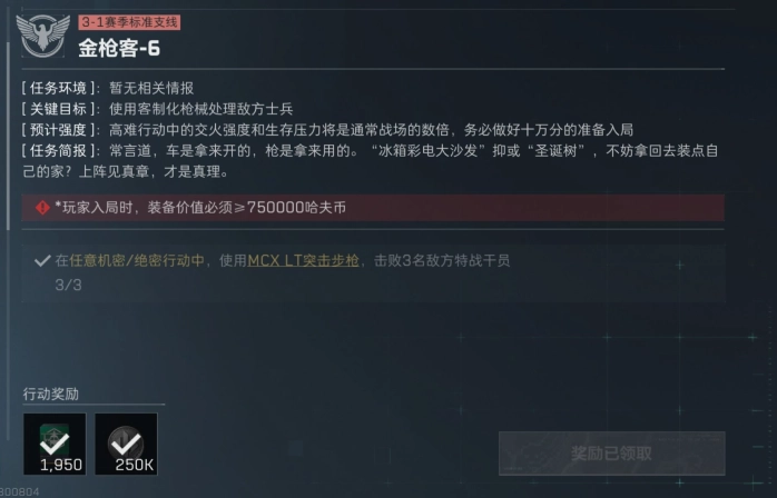 在任何机密或绝密行动里,使用【mcxlt突击步枪】,消灭3名敌方特战干员。