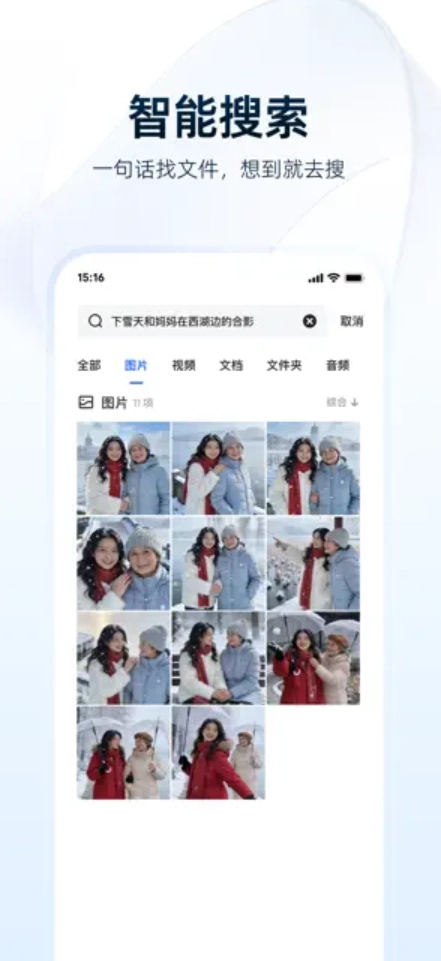 此外,夸克网盘App还具备智能相册与智能搜索功能,只需一句话就能快速找到目标照片,图片里的文字和文档内容也可直接搜索,极大提高了查找效率。