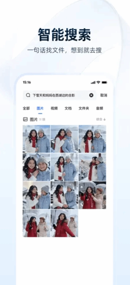 夸克网盘App还具备智能相册与智能搜索功能,只需一句话就能快速找到目标照片,图片里的文字和文档内容也能直接检索,让查找效率得到显著提升。
