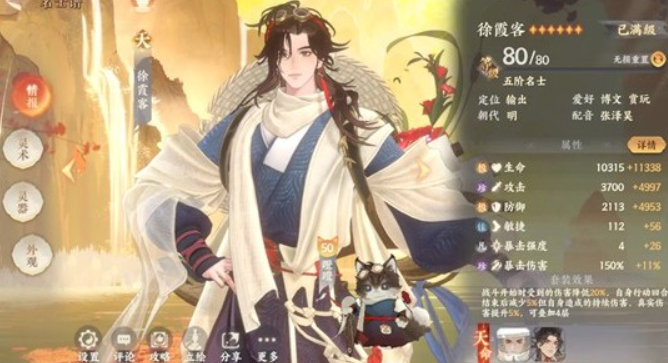 徐霞客在每次行动结束时会叠加1层“风物”效果。此外,若他的初始防御值超过3500,每超出1000点,就能额外获得10%的生命上限加成。
