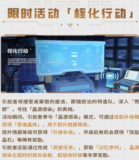 在晶源感染版本期间,限时活动“桎化行动”将同步上线。引航者会收到奥黛丽的邀请,跟随欧泊带领的特遣队深入荒野,探寻晶源感染背后的真相。活动进行时,引航者参与晶源感染模式,可通过拾取补给箱获取思维晶体,用于提升情报等级。情报等级提升后能解锁升级补给,开启补给有概率获得弦能晶石等稀有道具。此外,引航者完成调查任务,还可赢取记忆序列、晶源感染主题封装与基板、超弦体时装等丰厚奖励。