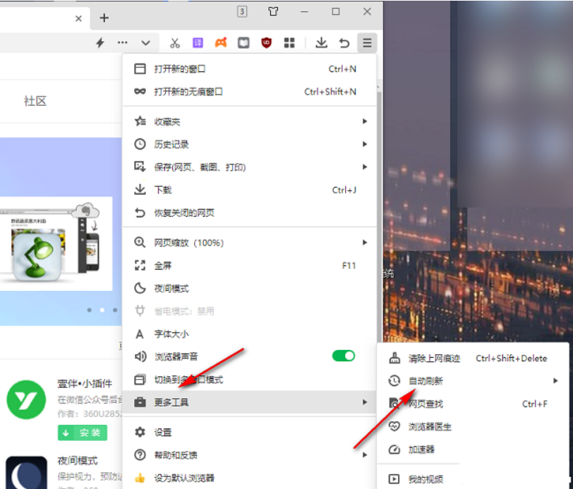 然后点击下方选项列表里的“更多工具”,之后再点击里面的“自动刷新”选项。