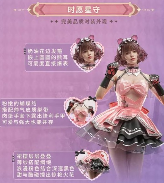“星愿誓约”时装采用粉色作为主色调,辅以精致的蝴蝶结与绑带设计,呈现出甜美与力量交融的风格。女性角色的裙摆层次丰富,薄纱与绸缎相互搭配,粉色与黑色的碰撞营造出浪漫又神秘的气质;男性角色则以机械背心和深蓝光圈熊耳为亮点,尽显优雅的绅士风范。