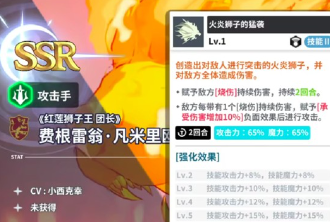 费根雷翁是黑色四叶草魔法帝之道燃烧队的核心输出担当,他的战斗逻辑完全围绕“烧伤”状态构建。每次施放技能后,被命中的目标都会在后续两回合里持续承受烧伤伤害,该效果不仅可以叠加,触发还十分稳定。尤为关键的是,费根雷翁的被动技能在觉醒后会让他的输出能力得到显著强化。处于初级觉醒阶段时,技能命中目标就能获得5%的伤害穿透效果,要是目标刚好处于烧伤状态,还能额外增加15%的伤害。当被动技能进阶为“火炎狮子的猛袭”后,伤害穿透效果会提升至10%,再结合烧伤状态的增益,最高能达成30%的伤害提升。凭借这样的能力,他在当前版本的火焰系角色中稳稳占据着T0的位置。