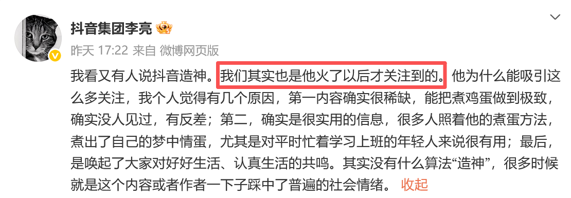 就在舆论满天飞的时候,抖音副总裁李亮直言出击,发文否认算法造神。并给出了“蛋神”爆火的三大原因,小雷觉得说得还挺在理。