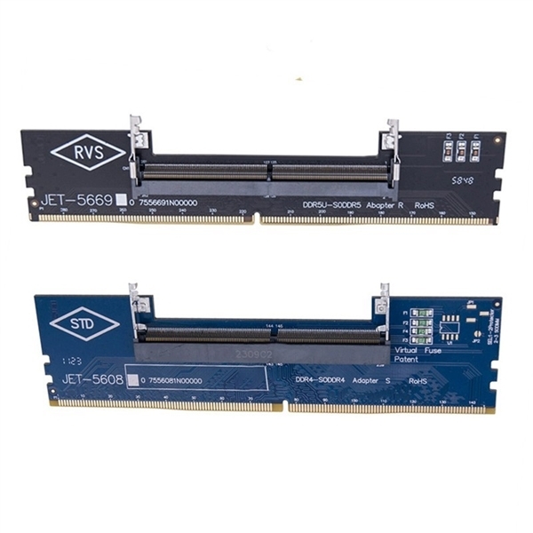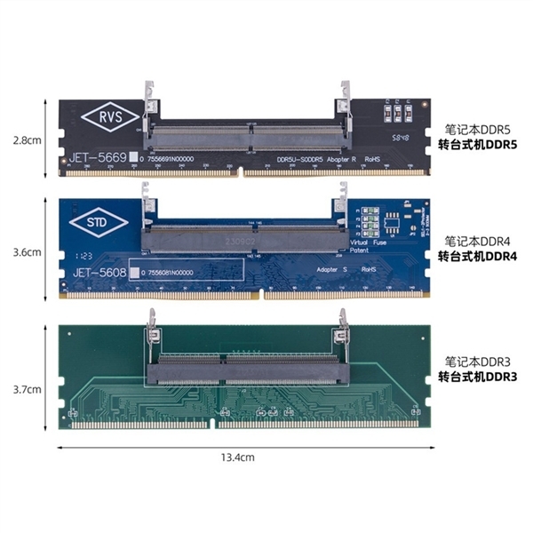 顾名思义,内存转接卡的作用就是把笔记本规格的内存通过转接手段用到台式机上,是不是感觉挺神奇的?那是不是意味着可以把DDR4笔记本内存转接后当作DDR5内存用呢?答案当然是否定的,内存转接卡仅支持同代内存转接——DDR4笔记本内存只能转成DDR4台式机内存来用,DDR3和DDR5的转接卡也是这个道理。