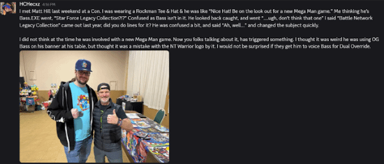 在《洛克人:双重超载》发布消息后,专门关注洛克人IP的国外媒体Rockman Corner发布文章称,他们的读者HCHecxz分享了自己曾在12月6日和配音演员Matt Hill见面的经历。