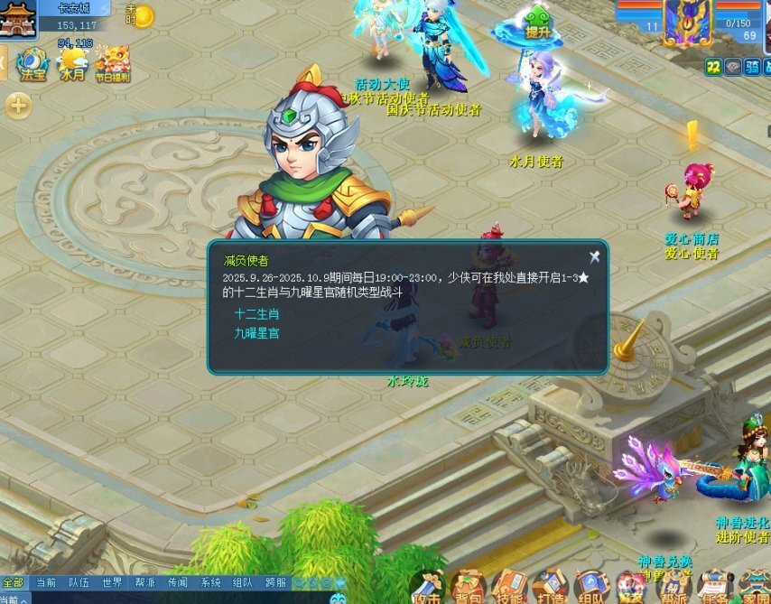 国庆活动期间的每晚19:00至23:00,各位少侠可前往长安城、望仙镇、桃花坞、楼兰、跨服十二九耀地图等地点,找到减负使者后直接开启十二生肖与九曜星官1-3星的随机类型战斗。减负使者的具体位置如下:长安城(158,119)、桃花坞(76,74)、望仙镇(95,74)、楼兰(62,70),以及跨服十二九曜长安城地图(158,119)。