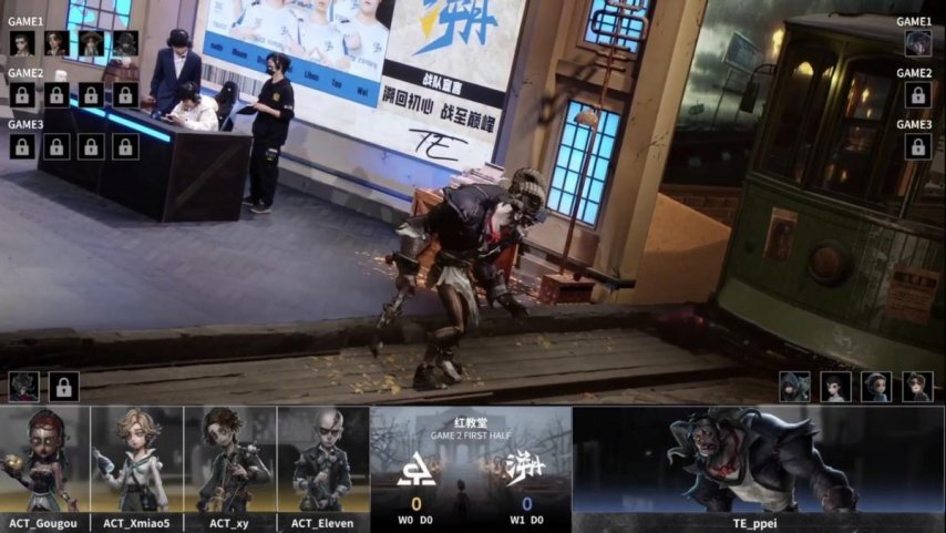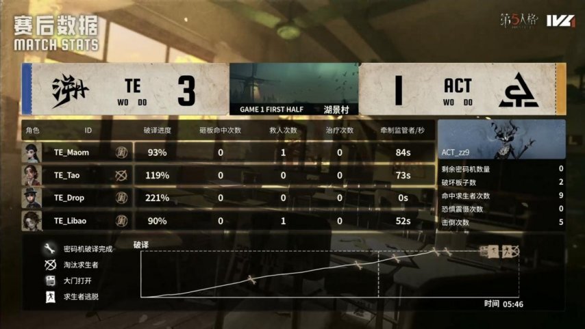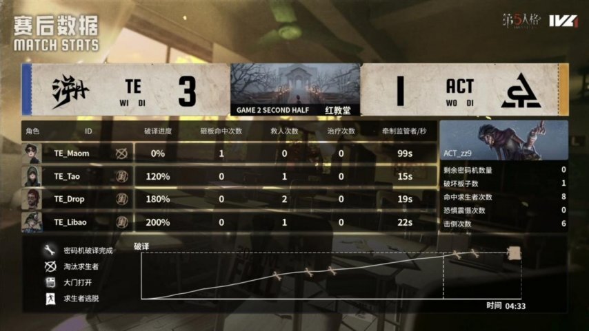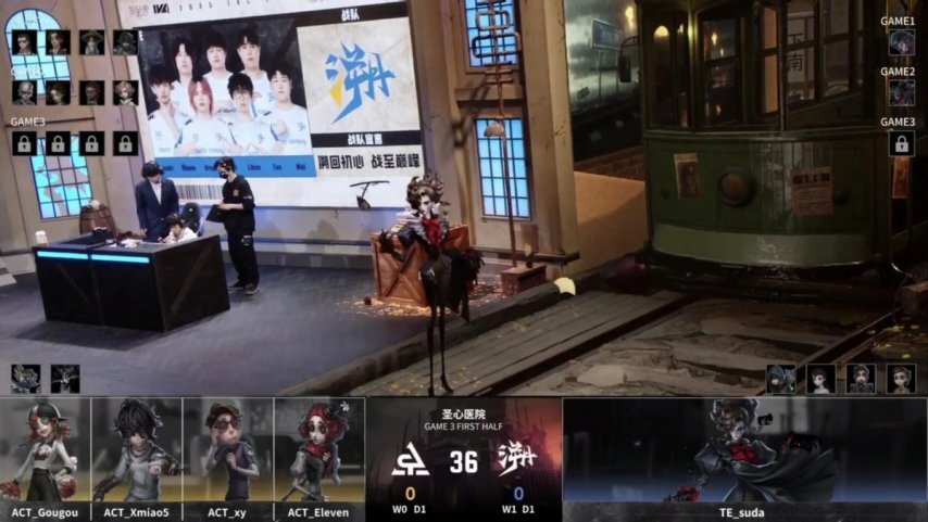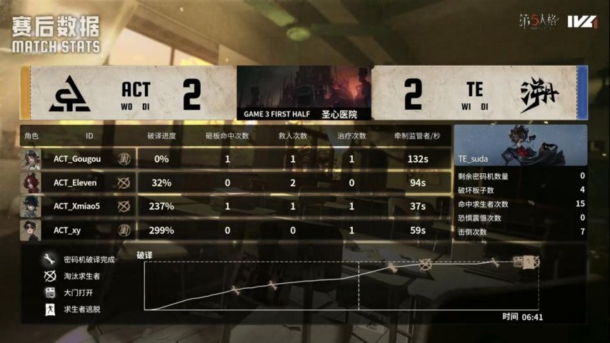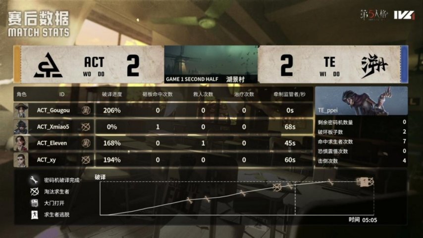 ACT战队的求生者阵容确定为拉拉队员、病患、幸运儿与哭泣小丑,禁用角色为“喧嚣”和时空之影;TE战队的监管者选手suda则选用了歌剧演员,禁用角色包括先知、古董商、冒险家以及空军。