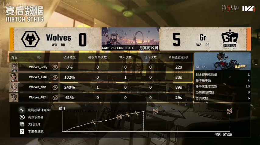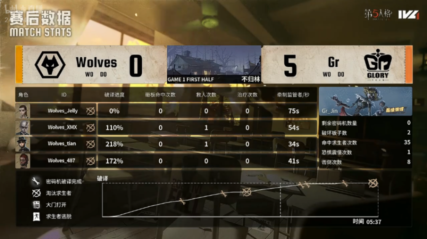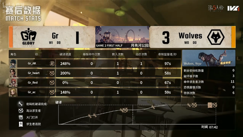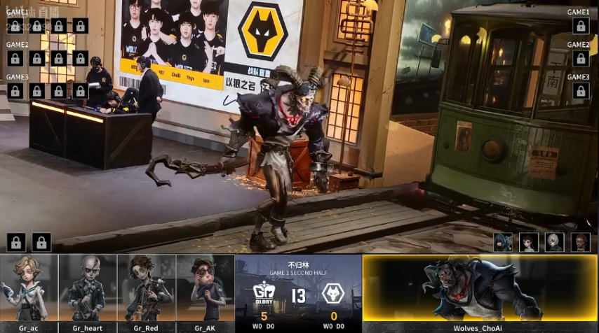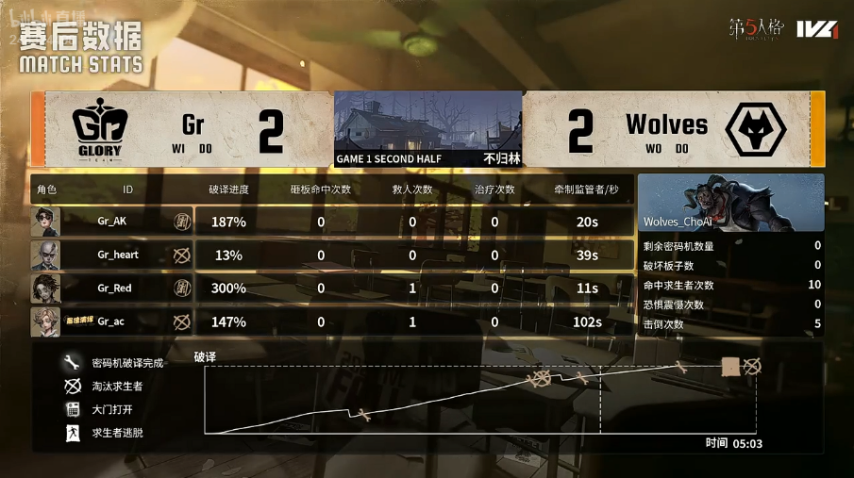 Gr的求生者阵营选用了气象学家、“逃脱大师”、木偶师与幸运儿;成都Wolves的监管者ChoAi则选定了“跛脚羊”。(禁用先知、古董商、守墓人、咒术师)