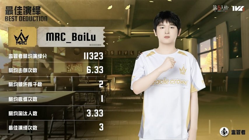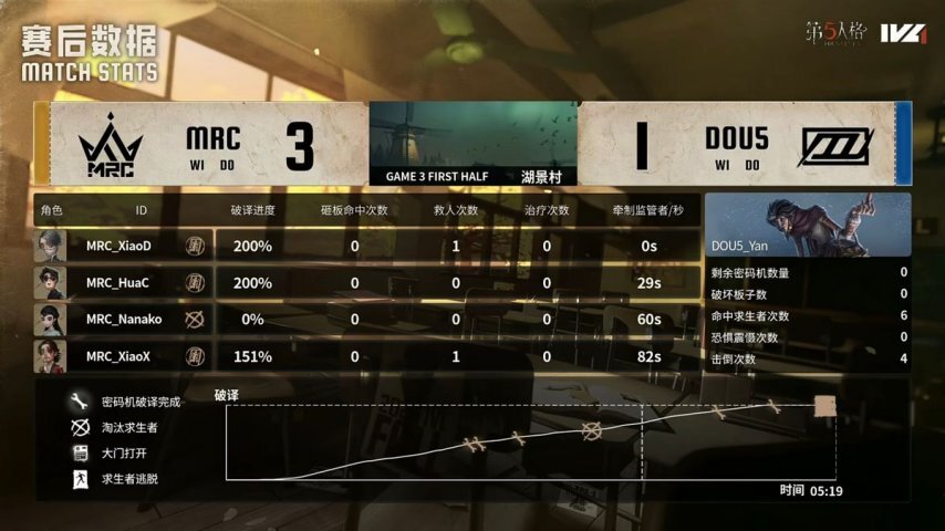 MRC求生者阵营选用幸运儿、入殓师、大副与古董商,禁用角色为时空之影和“跛脚羊”;DOU5监管者Yan确定使用杂货商,禁用的是“逃脱大师”、先知、“心理学家”及昆虫学者。