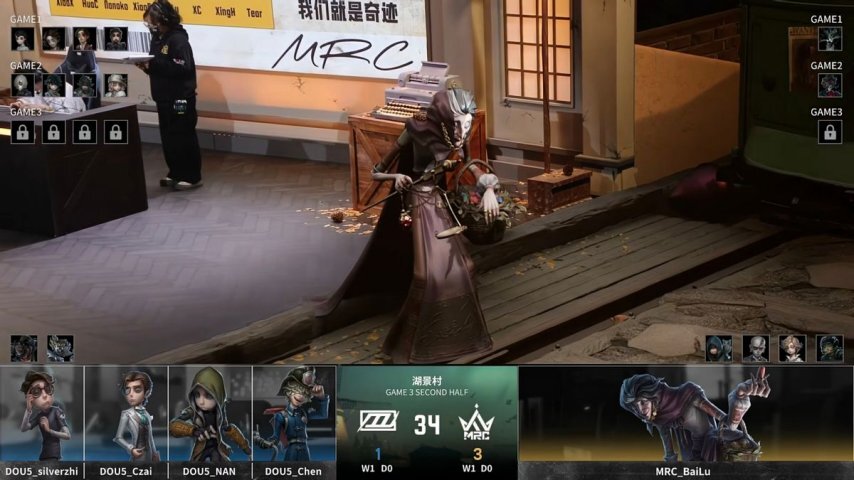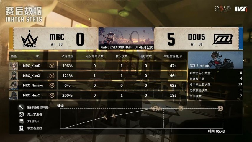 DOU5的求生者阵营选用了幸运儿、小说家、佣兵和火灾调查员,禁用了“跛脚羊”与“喧嚣”;MRC的监管者选手BaiLu则选定了杂货商,同时禁用了先知、“逃脱大师”、气象学家及前锋。