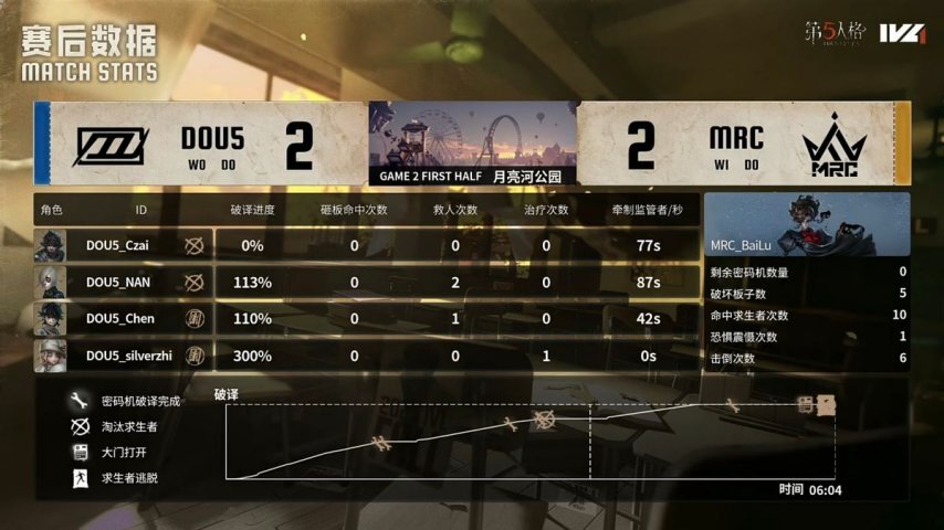 2025年10月6日,第五人格IVL秋季赛常规赛首周第五日的赛事拉开帷幕。当日,MRC战队凭借2胜0平1负、总比分18:9的成绩战胜DOU5战队,本场比赛的详细战报如下。