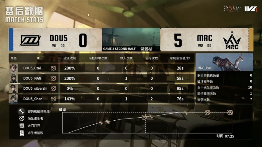DOU5的求生者阵营选用了“法罗女士”、飞行家、守墓人以及病患,同时禁用了“跛脚羊”;MRC的监管者选手BaiLu则选定了歌剧演员,其禁用名单包含先知、佣兵、气象学家和空军。