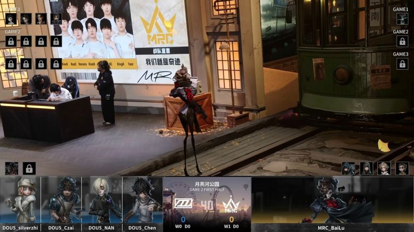 MRC的求生者阵营选用了飞行家、气象学家、佣兵与火灾调查员,并禁用了“跛脚羊”;DOU5的监管者选手mhxm则选定了歌剧演员,同时禁用了先知、古董商、大副和入殓师。