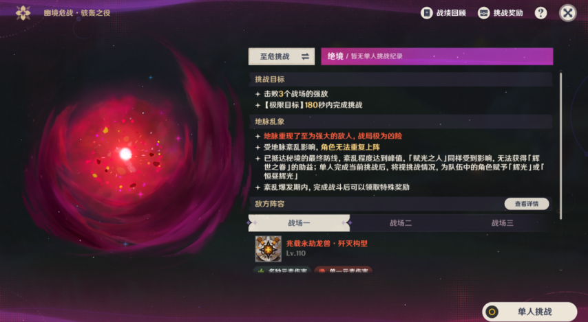幽境危战设有3个战场,且难度4及以上时角色无法重复使用。该玩法中的敌人均为单体Boss,多数还带有机制,所以可选配队相对固定,不像深境螺旋和幻想真境剧诗那般灵活。此外,幽境危战以0能量开局,对玩家的操作手法要求更高。