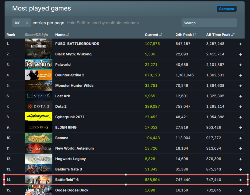 目前,《战地风云6》的Steam历史最高在线人数已超越《鹅鸭杀》,在该榜单上排名第14位。