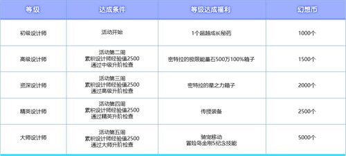 庆典设计师分为5个等级,达到后,获得的设计师经验值全部兑换成幻想币,可通过休彼德拉获得。