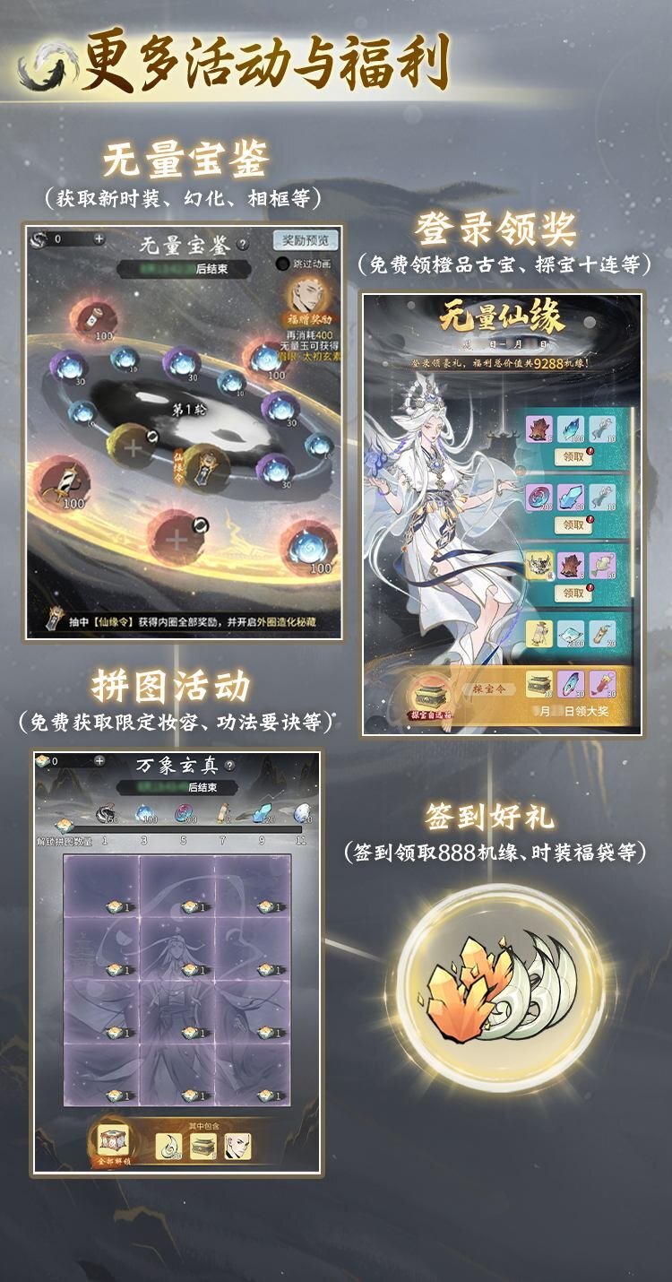 签到即可免费领取888机缘、时装福袋等好礼,福袋中说不定能开出永久时装;精魄转换、药园灌溉的双倍福利限时开启。参与万象玄真活动,限定妆容、功法要诀等奖励免费拿;探索无量宝鉴,还有机会获得新时装、幻化以及古宝。