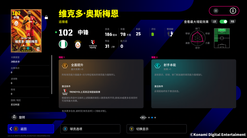 奥斯梅恩拥有【炮弹式头球】这项特殊技能,再加上89分的弹跳能力与88分的头球能力加持,他总能在禁区里腾空而起,把球狠狠顶进对方球门!