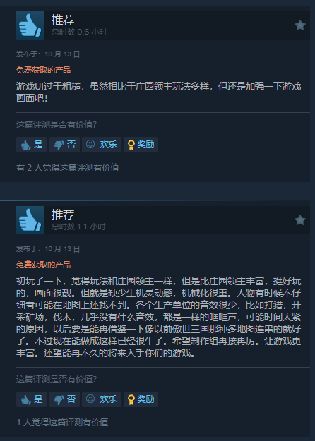 从目前仅有的评价来分析,这款游戏尽管能看出一些赶工的痕迹,但整体的玩法框架已经做得相当不错了,甚至在这方面还强过《庄园领主》。要是对这类游戏感兴趣的玩家,不妨去尝试体验一下。